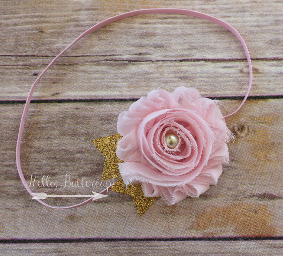 Pink flower is approx 2.5" with gold glitter ribbon accents and a gold pearl sewn in the center.