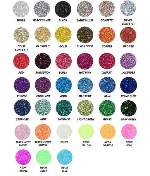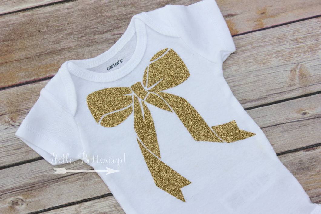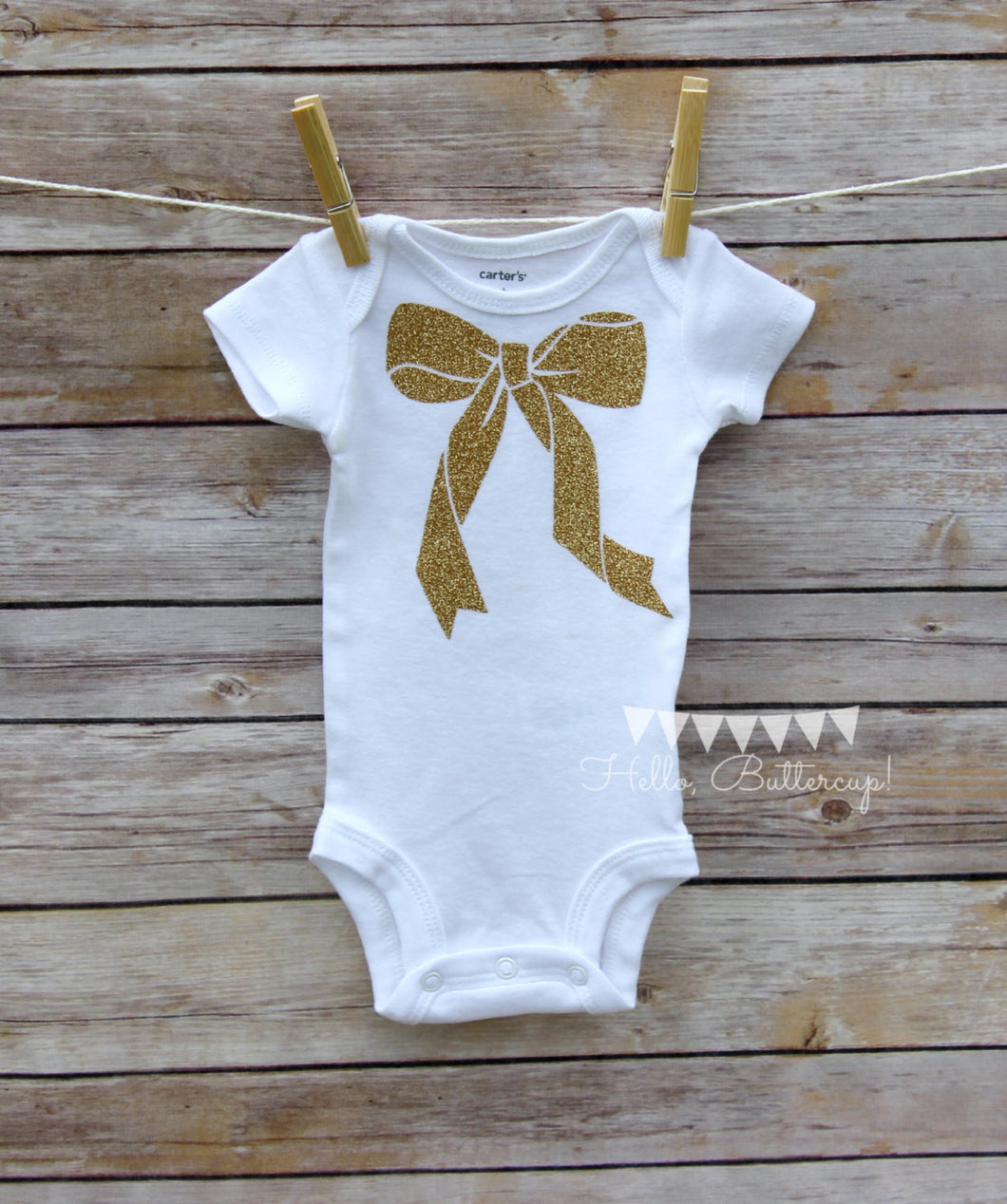 We use new high quality bodysuits and add a super sparkly glitter heat set applique, along with our original signature heart on the backside. This can be made in your choice of colors, see the chart for options. Leave a note at checkout with color choice or we will send the gold glitter as shown.